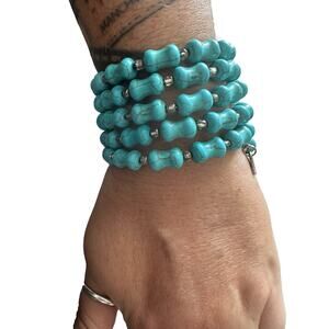 Handmade faux turquoise wrap bracelet. Get a stacked and layered look with this one-size fits most wrap bracelet. The beads are howlite dyed to look like turquoise. They're on a long wire and easily wrap around your wrist or you could even wrap it around your arm or ankle too. The bracelet has little silver "handmade" tags on them. I have a 7" wrist and it is shown on me and I got five wrap arounds with it easily. It's bright, eye-catching and perfect for Spring/Summer.