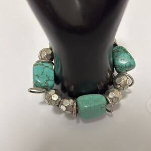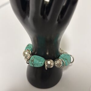 Artisan made stretch bracelet with 4 large faux turquoise stones, faceted silver tone beads and silver tone spaces.