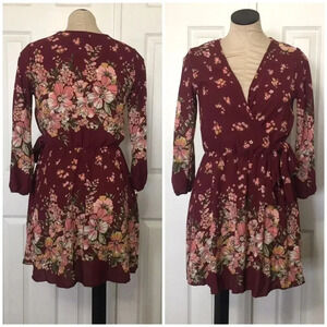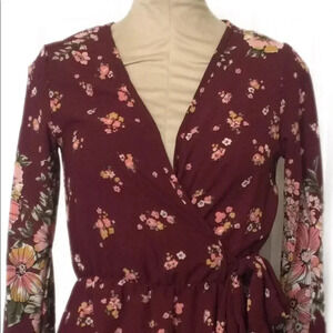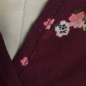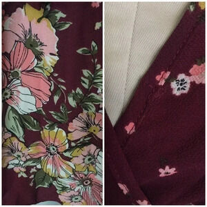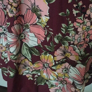 Is brand new with tags. Sewing defect at bottom of vneck. Burgundy base with colors of pink, white, gold and olive green. Material: 98% Polyester, 2% Spandex.