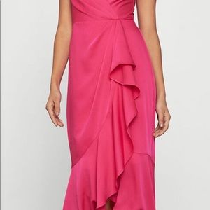 This sleeveless dress features a wrap bodice, adjustable shoulder straps, and a gathered waist that falls into a cascading ruffle on the mermaid skirt.