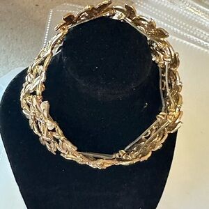 This matching set features a brushed gold tone and rhinestones. Both the bracelet and ring are stretchable for ease of wear and fit.