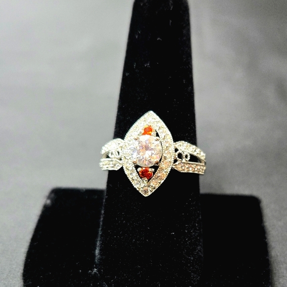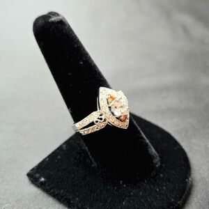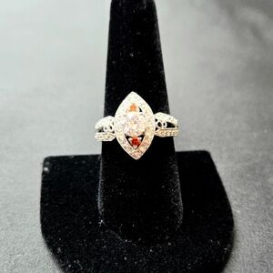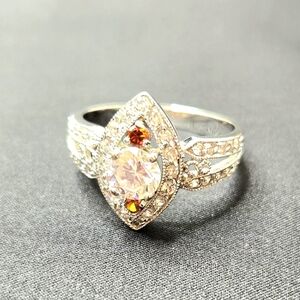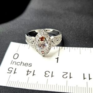Faux white diamond and citrine ring. It's very pretty and authentic looking. Very eye-catching. Silver plate band has some minor scratches upon close inspection. Otherwise it's in good pre-owned condition.
