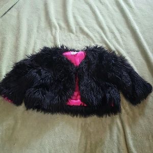 Black faux fur quarter sleeve crop jacket. Soft satin like inner lining.