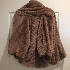 This faux fur shrug is a great staple for cold weather. The quarter length sleeves drape nicely to give a pretty accent to any outfit. The fur and lining are extremely soft and warm yet not too heavy. Like new conditions. 100% polyester. Front clasp.