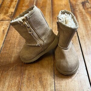 Baby girls size 2 Faux fur lined winter boots, Tan, zip up inside soles. Cute Ugg dupes.