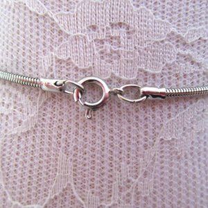 Faux jade silver tree of life pendant & 14" snake chain. Pretty wire wrapped pendant measures 2" and the silver tone snake chain is 14" and closes with a spring ring clasp. Green stones are glass of varied shades. This is a new, unworn necklace.