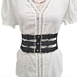 Faux leather Wide corset waist Black Belt studded Goth punk Triple buckle