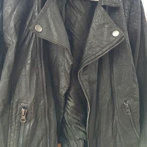 Faux leather jacket with zip front. Zipper is uneven, intentionally. Color is dark charcoal grey. Zipper metal is slightly discolored but works with this style jacket. Size is M but fits like a small.