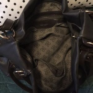 Medium gray w/ 3 inside pockets, 1 of which zippers. The whole purse has a zipper to close it. Lightly used.