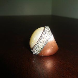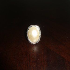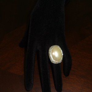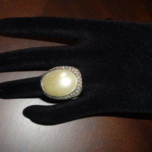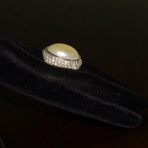 This is a massive oversized faux pearl ring with crystals frame. In a good condition: it has some scratches and tarnished band. It's very heavy but it looks beautiful when you wear it. It can be a great addition to wear on any events.