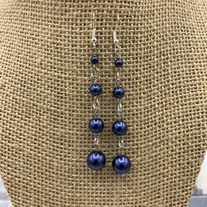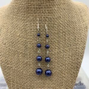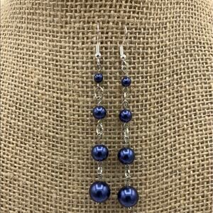 Blue Faux pearl drop earrings silver hypoallergenic hoops. Hand made. Dangly minimalist earrings