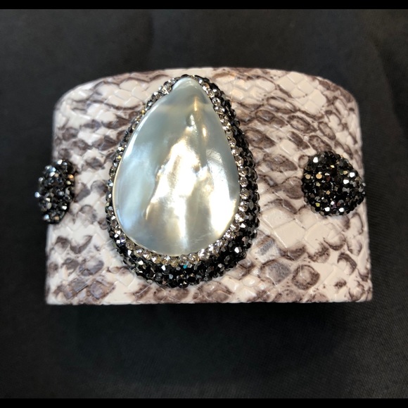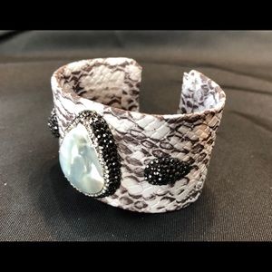 Comfortable faux python cuff with mother of Pearl & crystal detail. Excellent accent to any outfit. Neutral colors.