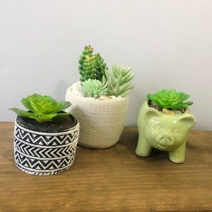 Three beautiful faux succulents perfect for table or shelf decor! The succulents look vibrant and the pots they are in add to the cuteness! I mean just look at that little piggy