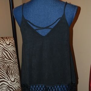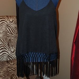 NWT Spaghetti strap top in faux suede with fring on bottom and cross back strap. Top is stretchy and very soft. From Rock 47 by Wrangler. Size: Large