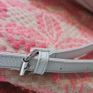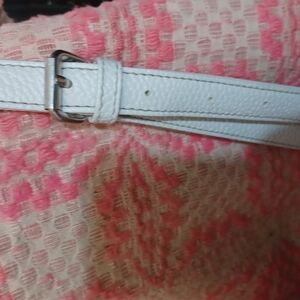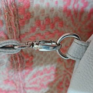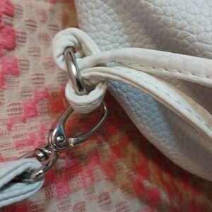 This is a gorgeous faux white leather bag. it has all silver Hardware. It has cute little white strap that hangs to Silver tassels . The straps in the back are adjustable they can go very long if desired many options for length. or you can use just one strap put it cross way in the back and use it as a crossbody bag because it is not a big backpack. It has a front silver zipper that's a pocket in the front and it also has the zipper that goes all around the top to open it has white lining it has a zipper inside pocket and it has a little pouch pocket. The straps are extremely easy to come on and off it's just one little clamp and they come right off and go right on. I liked it personally as a crossbody the size of this bag is 11 inches wide 9 inches high and 4 in in depth and the color pen this white goes with any type of outfit you've got on excellent condition
