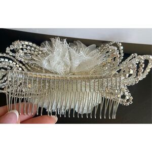 Stunning wedding hair comb with faux diamonds and flower accent. Soft feather plume highlights flow out from a This piece is perfect for any modern or vintage inspired bride and comes in both white and ivory. Perfect combined with a French net cage veil. You will feel extra beautiful on your special day!