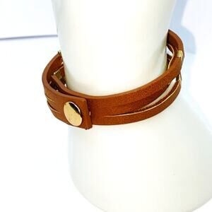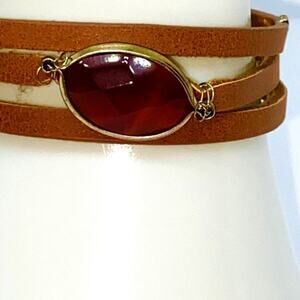 Faux-Leather layered bracelet with gold-tone hardware and a large red rhinestone. Adjustable snap-button closure.