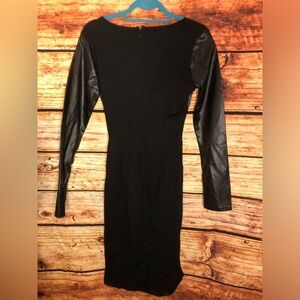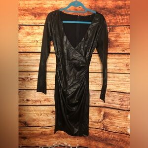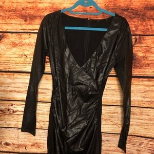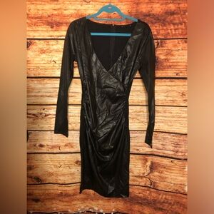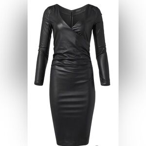 Sleek to the eye and soft to the touch, this long-sleeve, faux-leather dress gives your shape a flattering finish with side ruching at the waist. The plunging surplice V-neck mimics a wrap look that combines edge with elegance, while the back's stretchy fabric and zip closure provide a comfy, flawless fit.