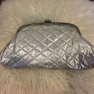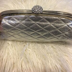 Silver Fake Leather evening bag w rhinestone closure. Wear as a clutch or w silver strap. Strap approx 7.5". Some wear inside but perfect for formal events.