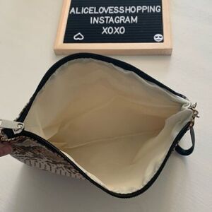 Faux Leather Snake Print Large Wristlet. Removable wrist strap and size of large clutch. Perfect for night out or running errands. Has zipper closure and roomy interior for this type of bag. Approximately 11.5” X 8”
