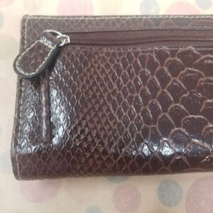 Approximate measurements are 7" x 4". Abiut 1" wide. Very good condition. Even has a place for a checkbook for those that still write checks. Room for cards and identification. BROWN.