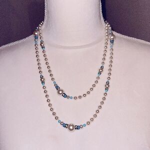 This beautiful faux Pearl necklace is adorned with blue beads! The perfect accessory for your attire!