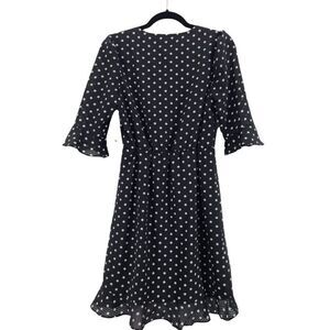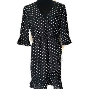 Timelessly cute and classic: Q & A's flowing faux-wrap dress features a polka dot print and ruffled accented sleeves. Black and white mixed media Dress.
