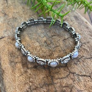 A very detailed pull on bracelet featuring faux crystals and pearls in two different settings Size.. circumference 2.5 inches