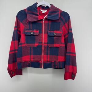 FavLux Fleece Jacket Womens Small Red Blue Plaid Waist Length Shacket Full Zip