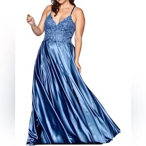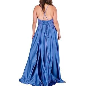 Faviana 9498 Blue Satin Formal Gown – Size 18 – Beaded Bustier & Corset Back NWT Make an unforgettable entrance at your next summer wedding, formal gala, or black-tie event in this stunning Faviana gown, designed to flatter and turn heads!