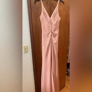 This faille satin dress features V-neck with just the right amount of plunge. The draped front adds texture to the long skirt, while the high slit reveals just the right amount of skin. The back is adorned with thin straps and ruching that are architecturally placed to flatter your figure. New with tags size 4 and 6.