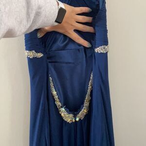 Faviana navy prom dress with bead detail in the front and lightly at the lower back, worn once. V-neck with a cris cross back that gives it a halter look from the front. Back is open with zip closure at the lower back. Dress is full length, and has a high/low tiered detail at the front (shown in first photo).