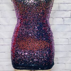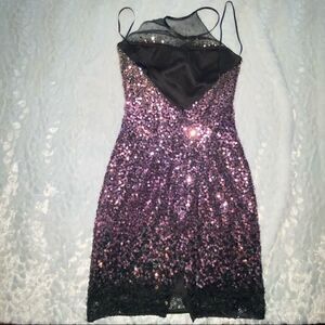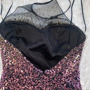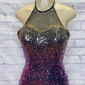 Ombré with black , purple and gold . Halter neck and deep cut back . Measurements are flat and approximate