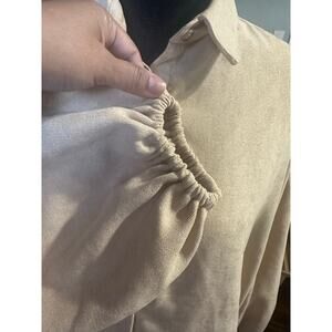 This Favlux beige long-sleeved button-down shirt features a flattering drawstring hem for a customizable fit. Soft, lightweight fabric makes it perfect for everyday wear or layering. Effortlessly combines comfort and style—ideal for casual outings, work, or weekend looks. Excellent condition, versatile, and easy to dress up or down.