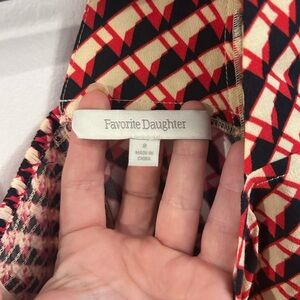 Designed with a geometric print, the Vineyard midi-dress from Favorite Daughter is styled with a sweetheart neck, long sleeves with button cuffs, and a smocked back.