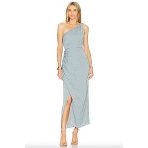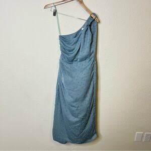 Favorite Daughter One Shoulder Midi Dress Slate Blue Polka Dot Ruched Buckle 4