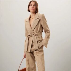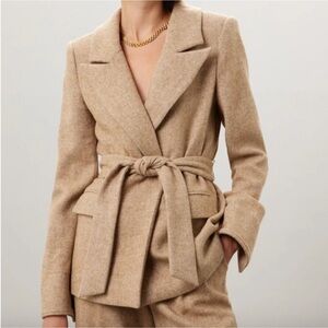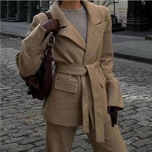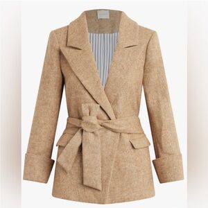 Stylish tan blazer with a belted waist. Features a classic lapel and front pockets. Perfect for a polished look.