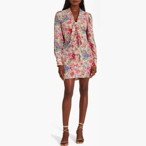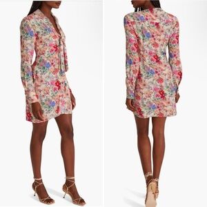 Style Description: Mini dress (not too short) with a flattering sheath silhouette | Tie front at the base of a deep v-neck | Long sleeves | Button cuffs | Concealed button front | Floral print