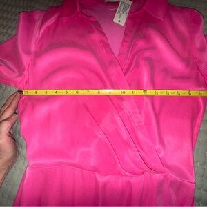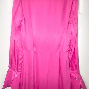 Turn heads at your next dinner party with the Favorite Daughter The Dinner Party Dress in Flamingo. This sleek mini dress boasts a wrapped silhouette, long button-cuff sleeves, and a soft satin fabric for a luxurious feel. With a pointed collar and invisible side zipper, this dress is a must-have for any fashion-forward guest. This dress was a sample dress at the store! There is no fabric information or size tag in the dress which is common for samples. I bought it at a sample sale, but it was too tight for me.
