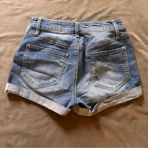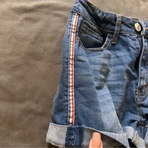 Favorite High-Rise Denim Shorts Blue Jean Cuffed Striped Trim Size 6 Stretch Fun