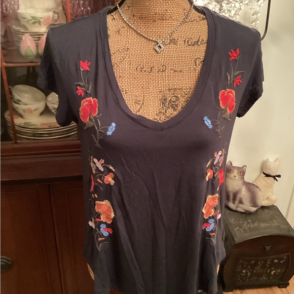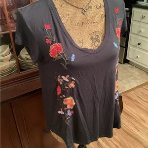 Charcole viscose knit, pretty embroidery, Vneck, new with tag, bust 40” and 23” long,