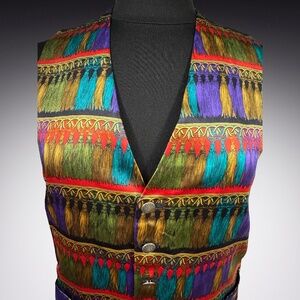 Made in London at a custom/bespoke tailor. Silk tuxedo vest with a bright colorful print that will pop under a black jacket. Functional welt pockets and decorative buttons finish the look. Perfect condition
