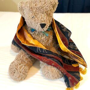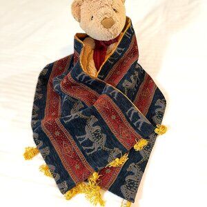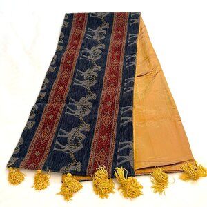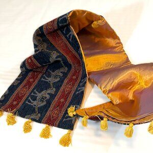 This is a scarf with a vague camel "Rock the Casbah" motif executed on one side in tapestry needlework in brilliant colors and on the other side in deep, golden silk. As I am wont to do, I offer here an item that HAS NEVER BEEN USED and is MINT CONDITION. This is beautifully constructed and will keep its shape whether it's wound around your neck or draped loosely your shoulder.