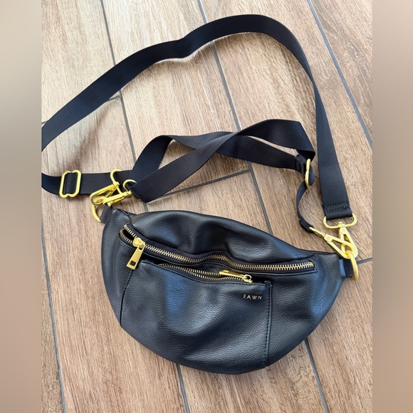 black leather crossbody belt bag with gold-tone hardware. Smooth pebbled leather with dual zip pockets for secure organization. Adjustable strap for comfortable, hands-free wear. Sleek everyday design that pairs well with casual and dressed-up looks.
