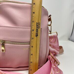 a pink and white patterned strap detachable for versatility , messenger bag,