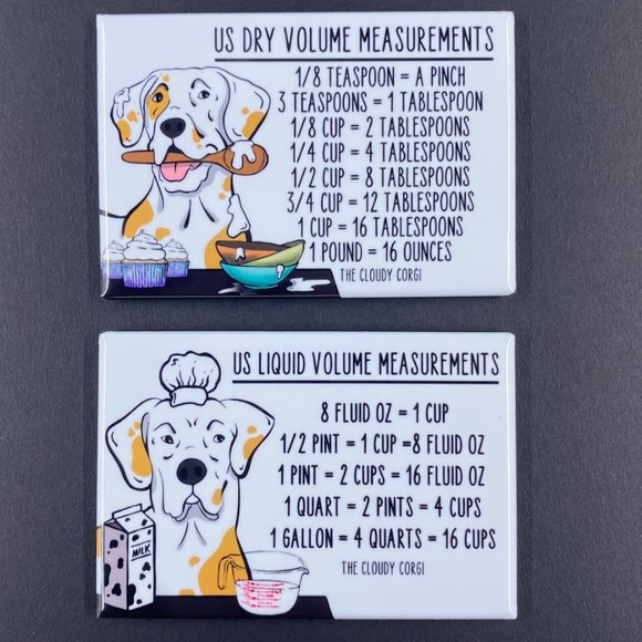 This handmade magnet set features hand illustrated dogs with handy conversion charts you can reference while cooking or baking!