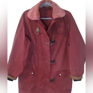 Great Vintage canvas Fireman's turnout coat, Fireman's jacket sturdy canvas with snap panel and heavy metal clasps, 2 patch pockets with snaps, suede cuffs, pink corduroy collar. Unfortunately this is missing the heavy wool liner for the colder days but still an awesome vintage find!!! dark pink mauve color Size S measures 21" pit to pit , 34" long. In great condition, the clasps are a bit tarnished and a bit of fraying on collar....see photos FA Fay
