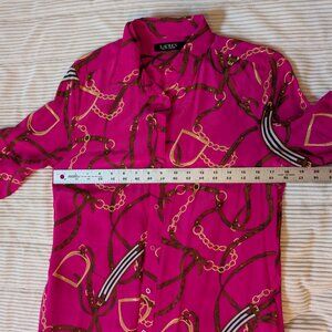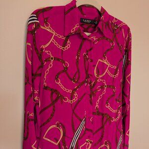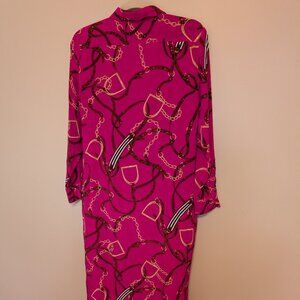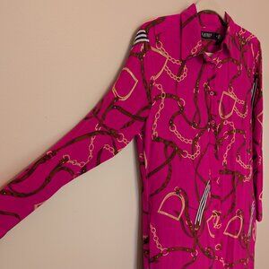100% Silk Ralph Lauren equestrian print bright pink shirt dress chain-link button front long sleeve midi length