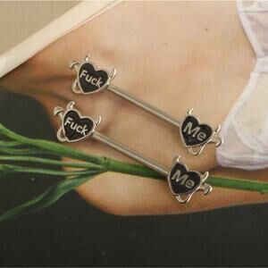 Introducing our devilishly delightful Stainless Steel Heart Barbells! 🔥 These 14 gauge nipple piercings feature heart shapes with wickedly charming devil horns, with the cheeky message "F*ck Me" on them. Perfect for those who like to add a touch of sexy sass to their style. Grab a pair and show your lover what you really want! 😈🖤