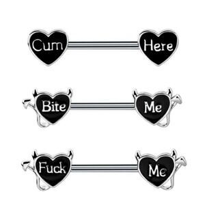 F*ck Me naughty barbell nipple rings pair 14g stainless steel black silver heart